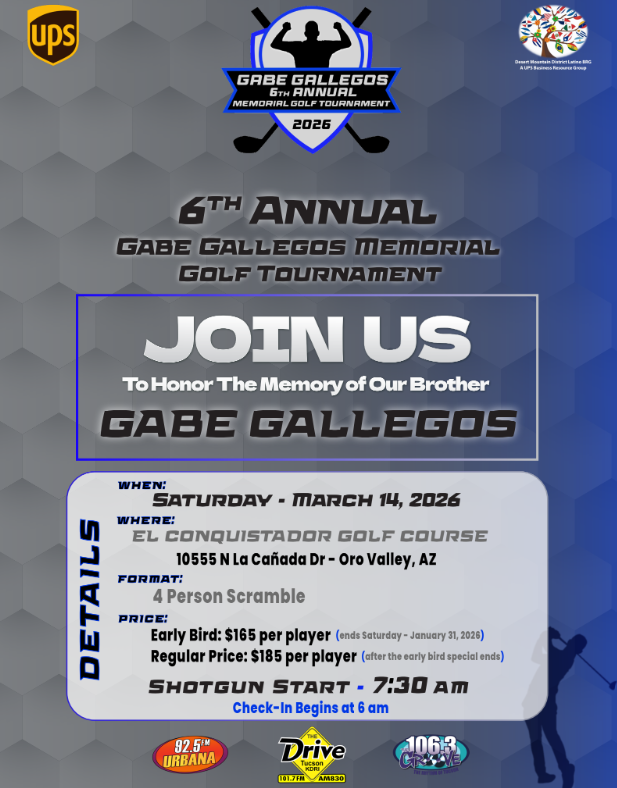On behalf of the Gabe Gallegos Memorial Foundation, we are excited to invite you to participate in our sixth annual golf tournament which will take place at the beautiful El Conquistador course on Saturday, March 14th, 2026. This year's event will be proudly sponsored by UPS, and all proceeds will directly benefit Tucson's youth, specifically in sports and music. The Gabe Gallegos Foundation has raised and given nearly $40,000 in sports scholarships to date. However, our goal is to double that this year, with a special emphasis on supporting the Sunnyside School District Mariachi programs, who are in much need of financial support. 100% of all proceeds will be donated to the community, and all funds will be facilitated through the Sunnyside School District Foundation.